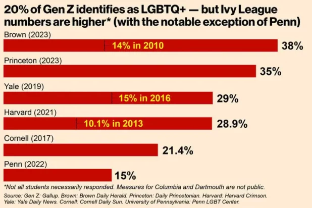 According to the Census Bureau, 20% of Gen Z is LGBTQ+, far more than older cohorts. But Ivy League students far outstrip their generation as a whole.