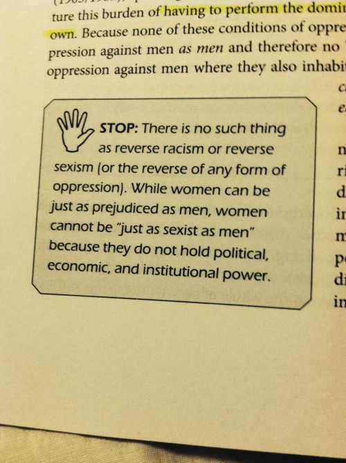 STOP: There is no such thing as reverse racism or reverse sexism (or the reverse of any form of oppression). While women can be just as prejudiced as men, women cannot be “just as sexist as men” because they do not hold political, economic and institutional power.