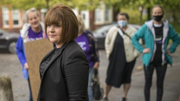 Supporters waited outside the police station in Coatbridge on Thursday carrying placards with the hashtag “women won’t wheesht [be quiet]”, popularised by Millar and other activists online, tying ribbons in suffragette colours to nearby posts and some wearing fake moustaches.