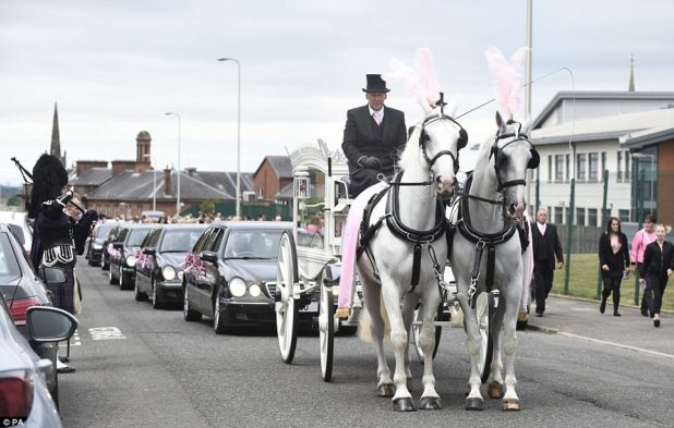 After the ceremony Alesha’s family carried her little pink coffin to the waiting hearse, a white carriage drawn by two white horses with pink feathers and pink drapes.