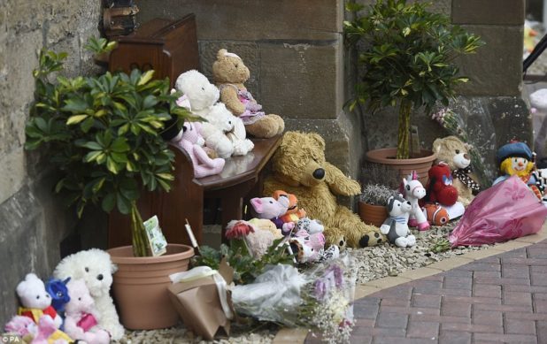 A piper played as mourners entered Coats Funeral Home in Coatbridge, North Lanarkshire, on Saturday, with dozens of bows tied to the railings of the building while cuddly toys including teddies and unicorns lined the wall outside.