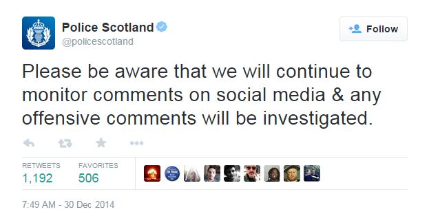 Apparently the UK and Scotland must not have a whole lot of crime problems as the Scottish Police have issued a tweet saying that they will be monitoring social media for offensive comments. Guess they must have deported all of the Africans and Muslims that have entered the country illegally if this is what they are focused on.