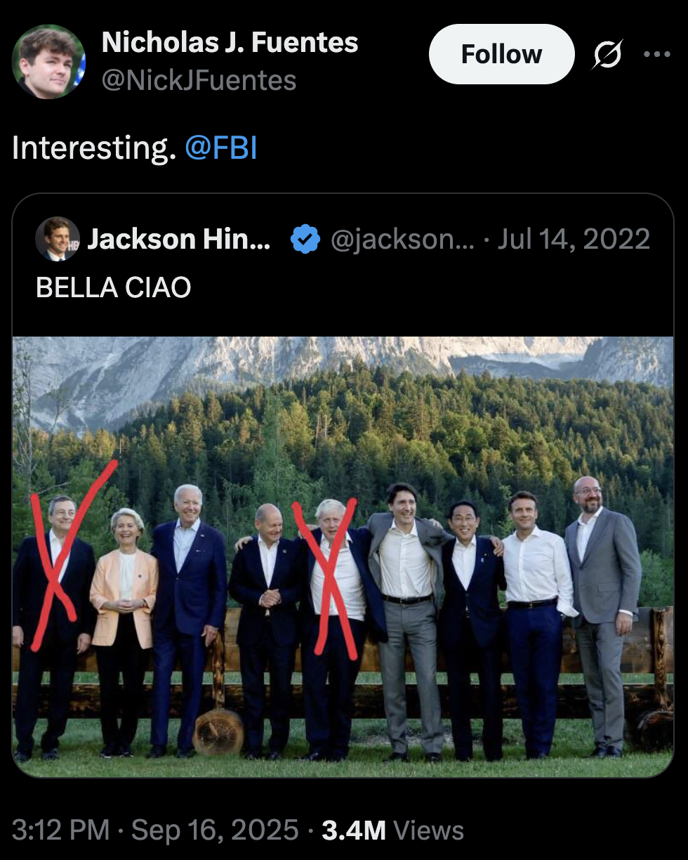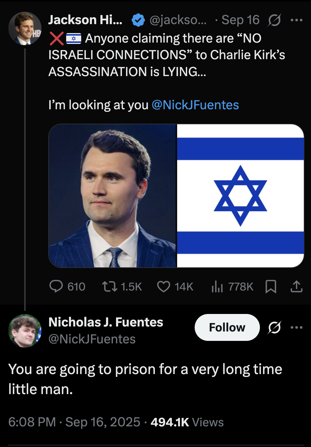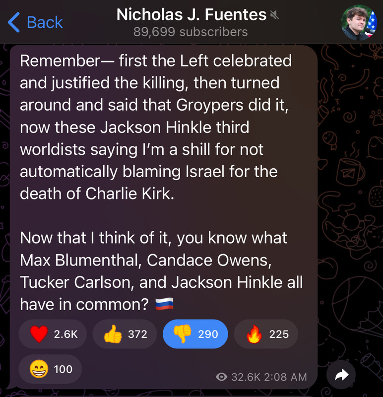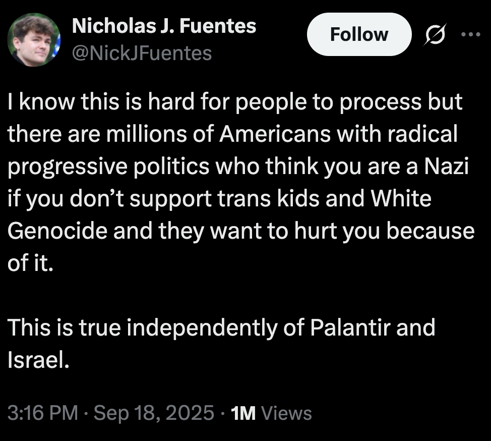 Nick Fuentes is out of the media now. People I know who don’t really even care that much about politics were contacting me like, “yo, what’s going on, why are they astroturfing this guy like this, what are they trying to do?” and I was like “um, this is, um, eh, it’s just, you know, kind of a boring story, really.” But the thing got too weird and so the media eventually dropped it. It’s possible he’s gone forever now, at least gone from that level of exposure, because he was just so unprepared to play that role. Being very quick on your feet when talking does not mean you’re able to formulate ideas, and telling him to go out and say everyone is a Russian agent and the FBI is totally telling the truth about Charlie Kirk, without giving it a definite script, turned out to be a complete disaster and basically everyone was disgusted by the whole charade. It’s possible that they will still use him as this kind of official opposition figure, I don’t know. They’re unlikely to find anyone more stable. One of their other guys recently released tapes of him having sex with men from Grindr. (I’m not going to tell that story, I’m sure anyone can look it up. Basically, an FBI antisemite guy released gay sex tapes because I guess he was being blackmailed. He also smokes meth, so maybe he just thought he was being blackmailed.)