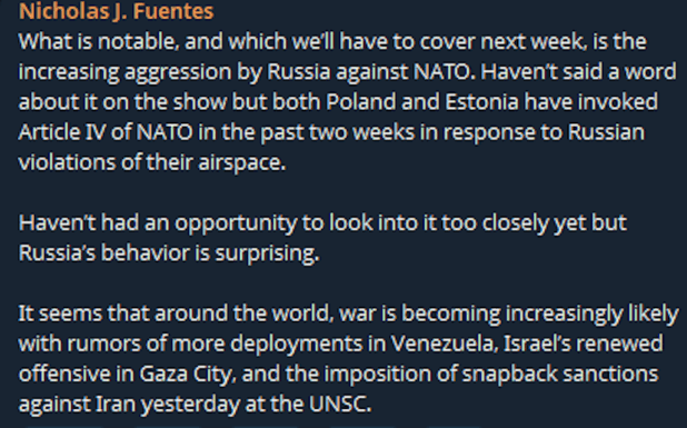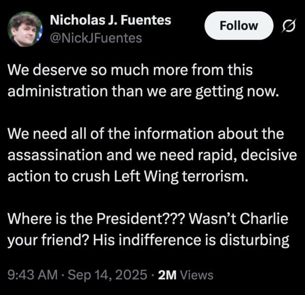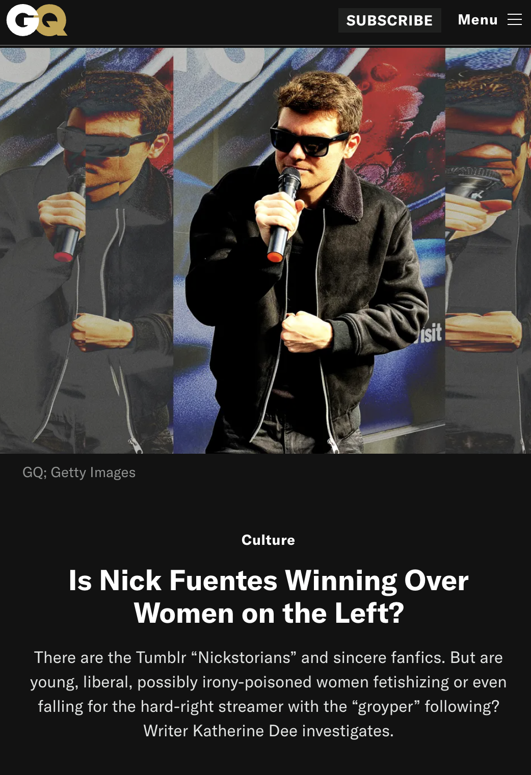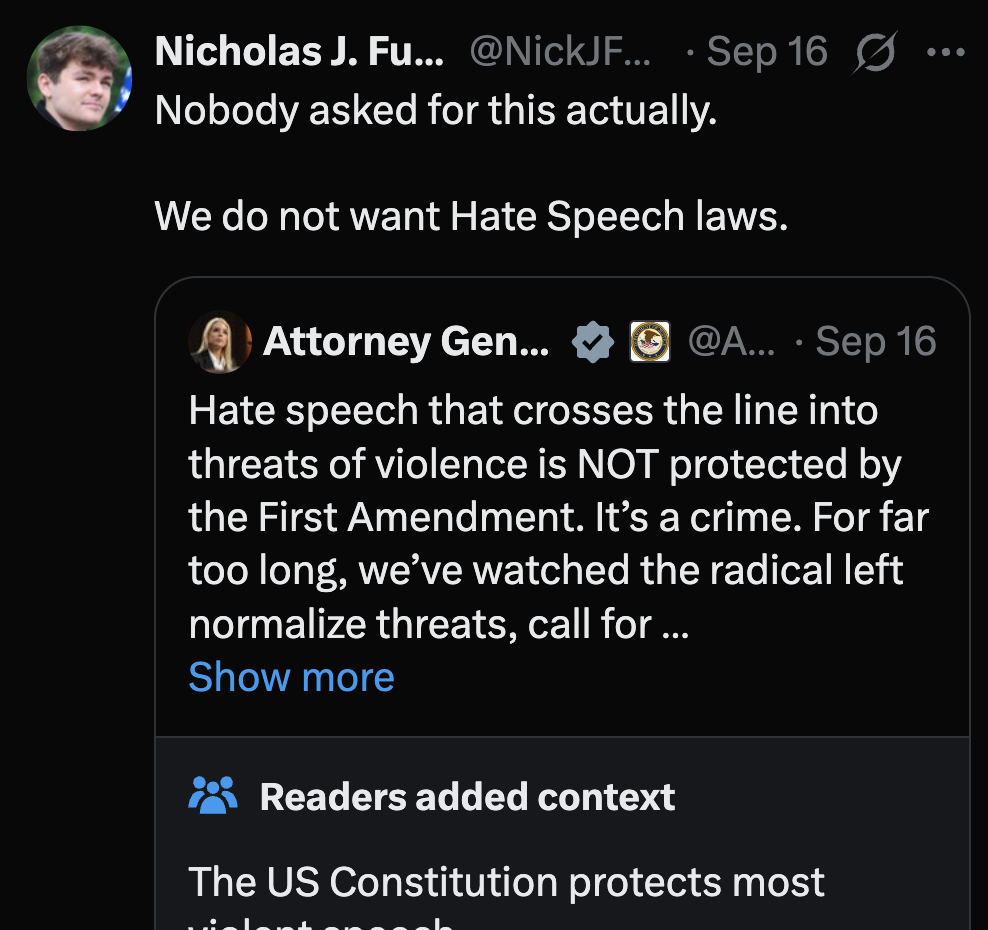 Nick Fuentes is out of the media now. People I know who don’t really even care that much about politics were contacting me like, “yo, what’s going on, why are they astroturfing this guy like this, what are they trying to do?” and I was like “um, this is, um, eh, it’s just, you know, kind of a boring story, really.” But the thing got too weird and so the media eventually dropped it. It’s possible he’s gone forever now, at least gone from that level of exposure, because he was just so unprepared to play that role. Being very quick on your feet when talking does not mean you’re able to formulate ideas, and telling him to go out and say everyone is a Russian agent and the FBI is totally telling the truth about Charlie Kirk, without giving it a definite script, turned out to be a complete disaster and basically everyone was disgusted by the whole charade. It’s possible that they will still use him as this kind of official opposition figure, I don’t know. They’re unlikely to find anyone more stable. One of their other guys recently released tapes of him having sex with men from Grindr. (I’m not going to tell that story, I’m sure anyone can look it up. Basically, an FBI antisemite guy released gay sex tapes because I guess he was being blackmailed. He also smokes meth, so maybe he just thought he was being blackmailed.)
