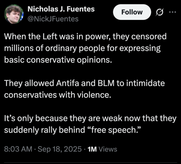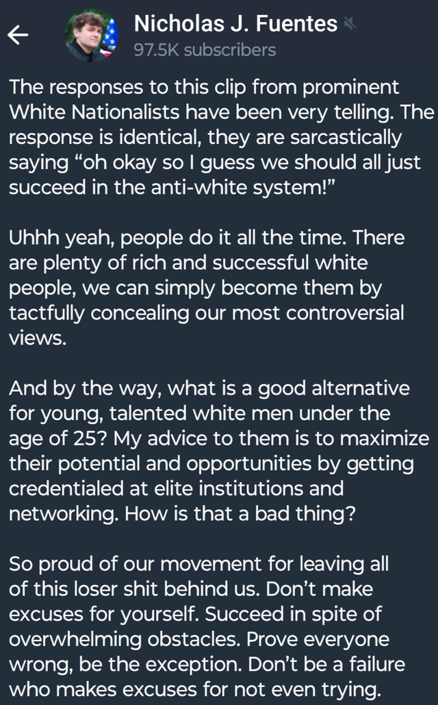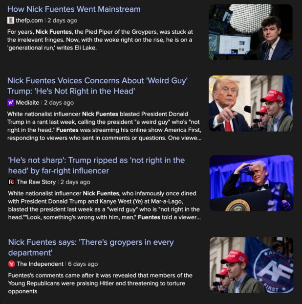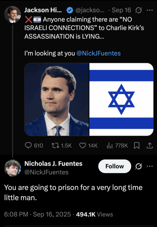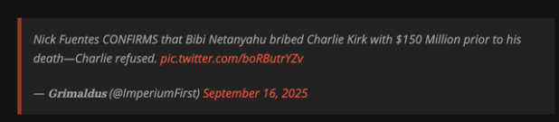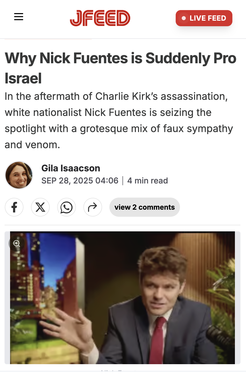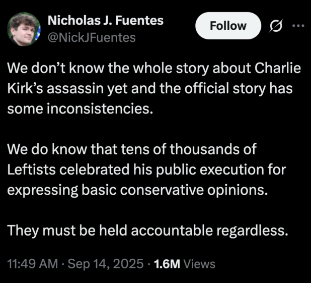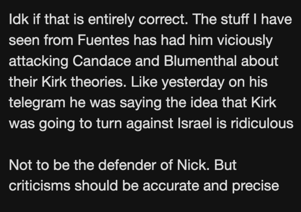 If you find yourself in a situation where antisemitism has become so mainstream that you need a controlled opposition antisemite to be plastered everywhere, Fuentes is the best you’re going to do. I would argue that the mistake was putting him on the Charlie Kirk case. It’s confusing what exactly they were even thinking. It could have been a pressure test, to see how capable he was of forwarding an extremely unpopular narrative, to see how moldable his followers were. But again, they don’t have some list of people lining up to take his place. The fact that you’re going to put yourself in the “public antisemite” space basically means you are insane, either driven by pure antisocial desires or some terrible sense of justice. If it is the former, it’s only a matter of time before you end up burning yourself. Virtually all of these people that I’ve seen have ended up in some kind of homosexual scandal. For Matt Heimbach, it was a sex scandal with his mother-in-law. Kudos to him for keeping it hetero. I guess.