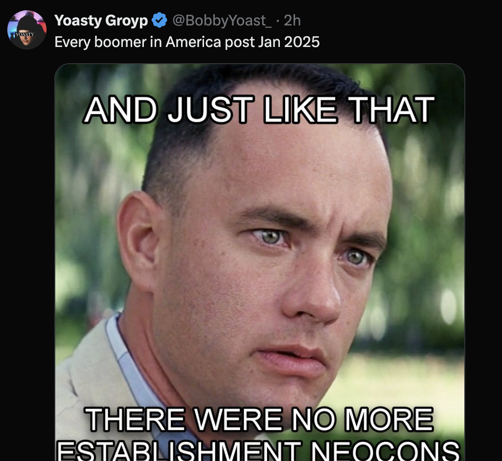 The next phase of the Iran thing is about to get rolling. Maybe I will have been right and Trump will end the Ukraine thing as that gets started, I don’t know. That seems possible. But yeah, just check the news: Israel is saying the ā€œoperationā€ is still ongoing, they are bombing Yemen again, they are threatening constantly, the Lebanese government is trying to disarm Hezbollah, Australia just accused Iran of burning Jewish restaurants in Australia (???), Iran is doing military drills and saying a new conflict ā€œcould erupt at any moment,ā€ China is shipping in weapons, CENTCOM is doing a leadership shift, the US is saying Iran is planning to attack America. And so on.