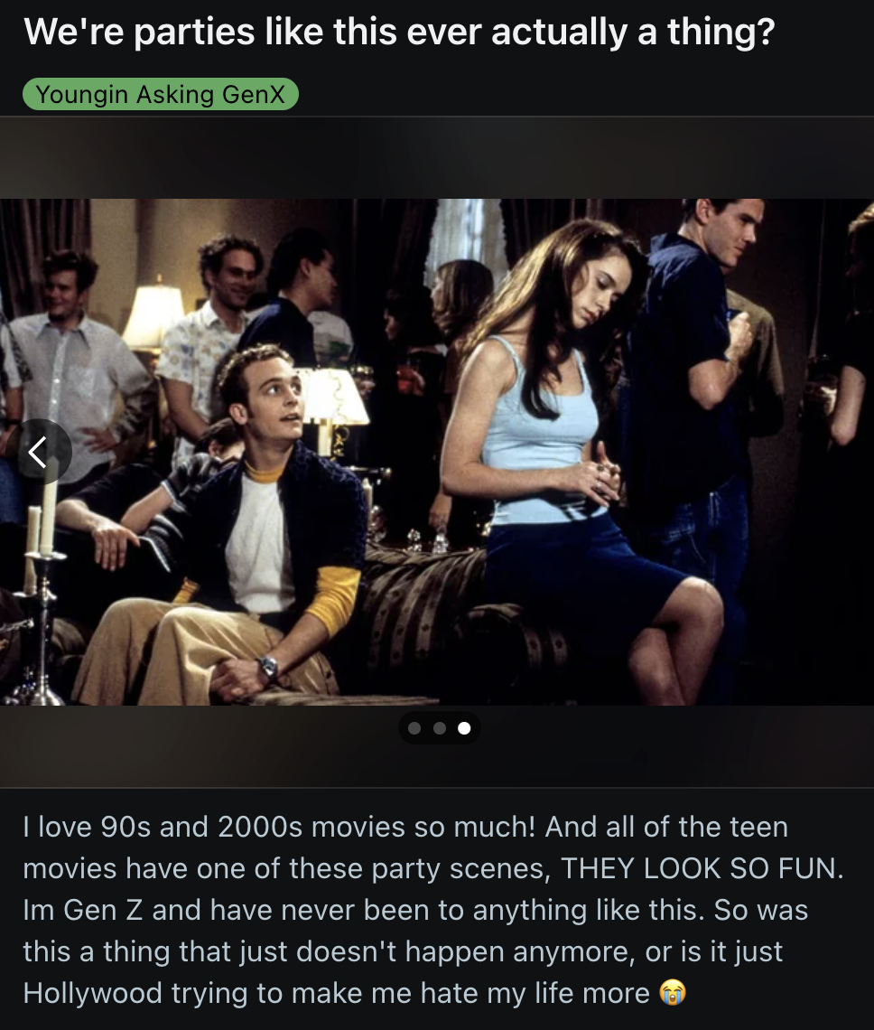 I recently saw some zoomer plebs shocked by scenes from 1990s films showing that high school kids went to parties on the weekends and hung out with each other, having fun times. Apparently, zoomers and younger (zoomers are all like almost 30 now actually, the generation younger than them I think is called Gen Q), just stay in their houses and masturbate.