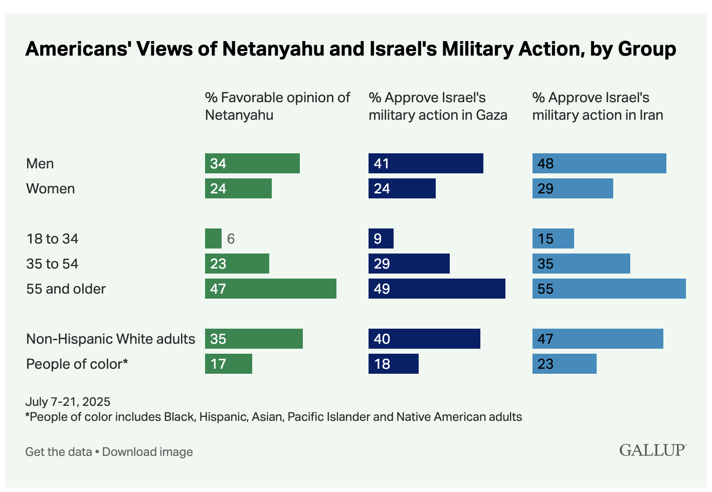 The 35-54 age group is much too wide. Of the 23% of that group that have a positive view of Bibi, I would think the overwhelming majority of the supporters would be between 45 and 54, whereas 35-44 would have the same opinion as 18-34.