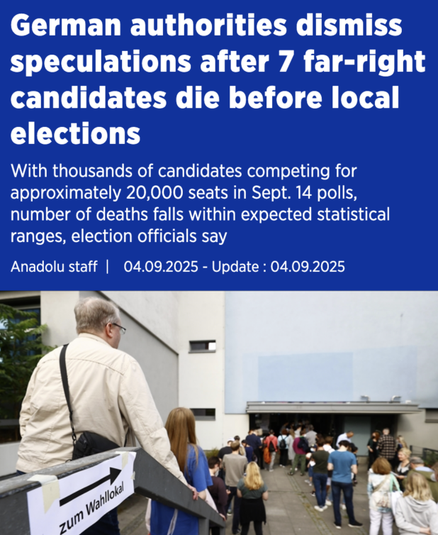 This story is a week old, but seven (7) candidates from the right-wing AfD party died in the few weeks before the upcoming election.