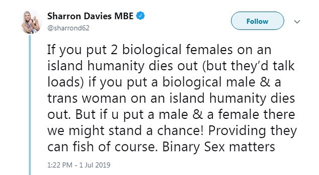 As some accused her of being a TERF (trans-exclusionary radical feminist), Davies tried to explain that the idea of two people stuck on an island was just an analogy for her point.
