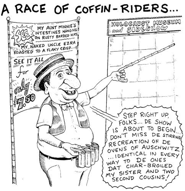 But it’s not just the Israeli government and high-profile Jews who can financially benefit from the Shoah. Any Jew who has business sense and an inability to feel shame (which is to say, all Jews) can rake in some extracurricular shekels from that greatest of lies if they put their minds to it.