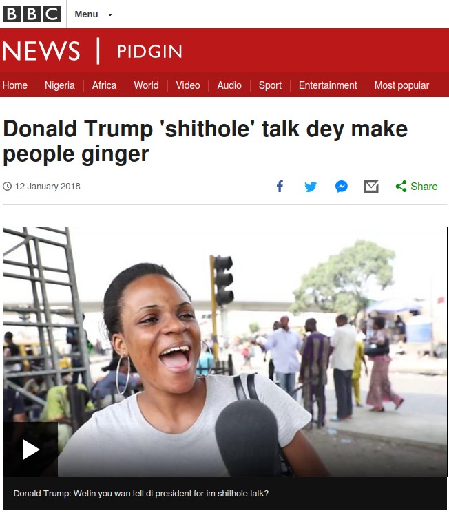 BBC Pidgin is a nice little glimpse into the future of the West. Stories about racist stores being looted, women throwing poop, and then they have the nerve to say that Trump’s “shithole” comment makes people feel “ginger” at number two – which I assume is a reference to having to go number two as well.
