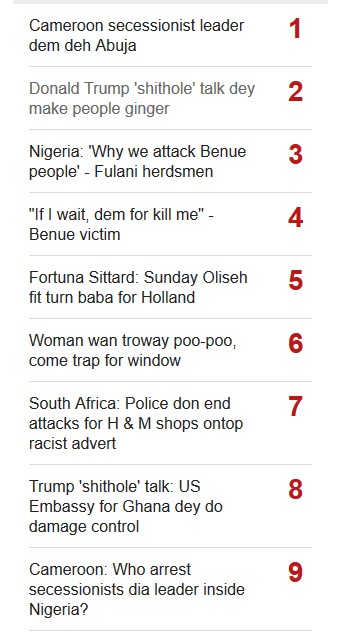But I’m sure it was enlightening. Speaking of which, the top ten stories on BBC Pidgin are: