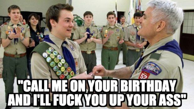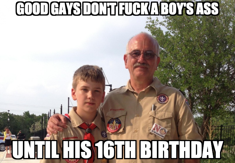 A good gay scout leader (non-pedophile) invites a 15-year-old Boy Scout to join him in a morally good and righteous act of ass-fucking on his birthday – but not a day before, when it would be evil and pedophilia.
