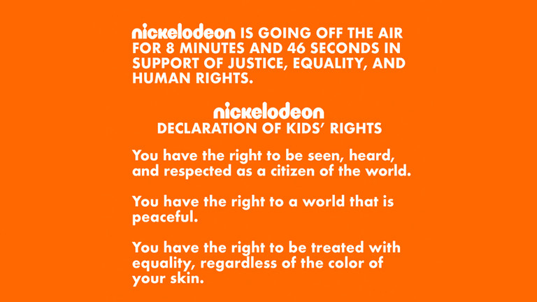 The channel, owned by Viacom, stopped its transmission for eight minutes and 46 seconds on Tuesday “in support of justice, equality, and human rights,” presenting children with a black screen on which the phrase “I can’t breathe” faded in and out, timed with audio of a person breathing. That spot was preceded by a promotion scrolling Nickelodeon’s “Declaration of Kids’ Rights” over an orange background and a pledge to “stand in solidarity” with “Black colleagues, creators, partners, and audiences” while condemning racism and violence.