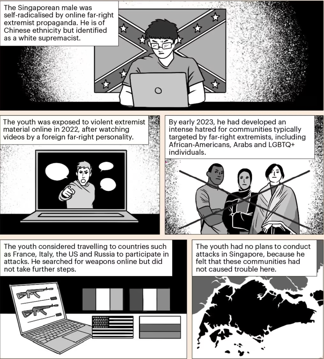 A 16-year-old Singaporean student who identified as a white supremacist and aspired to conduct attacks against minority groups overseas was issued with a restriction order under the Internal Security Act in November 2023.