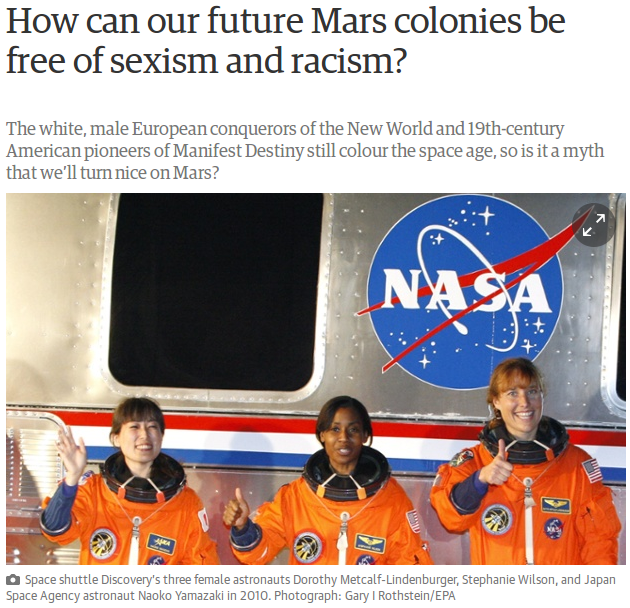This is the new SJW meme: when we finally colonize space, these colonies will be dominated by White males, and we must do something to make sure this doesn’t happen, the best option apparently being to just cancel the whole project.