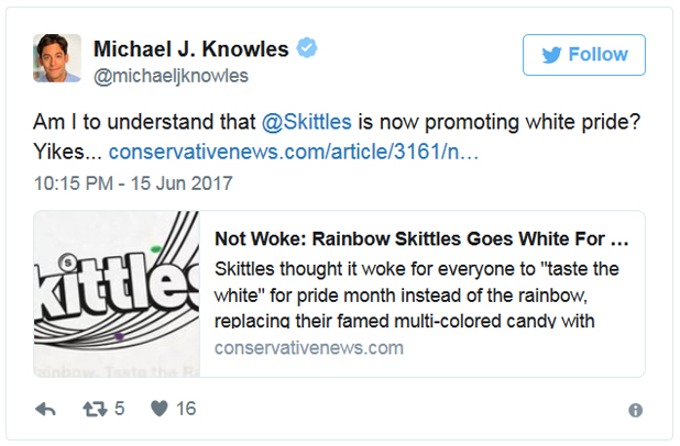 Now, I’m pretty sure that any good marketing executive would probably advise companies to avoid associating white anything with “pride” anything in the future. This knee-jerk offense, however, is absurd. Skittles was trying to do a nice thing, and — as is all too often the case — people need to calm down.
