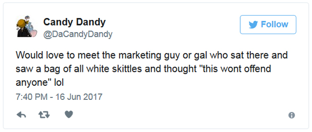 The Skittles team are better off embracing their obvious White Power leanings and coming out as proud supporters of the Confederacy. At least then they would have an established fanbase (Whites and the Black majority who secretly wish they were still slaves) to which they can sell their product.