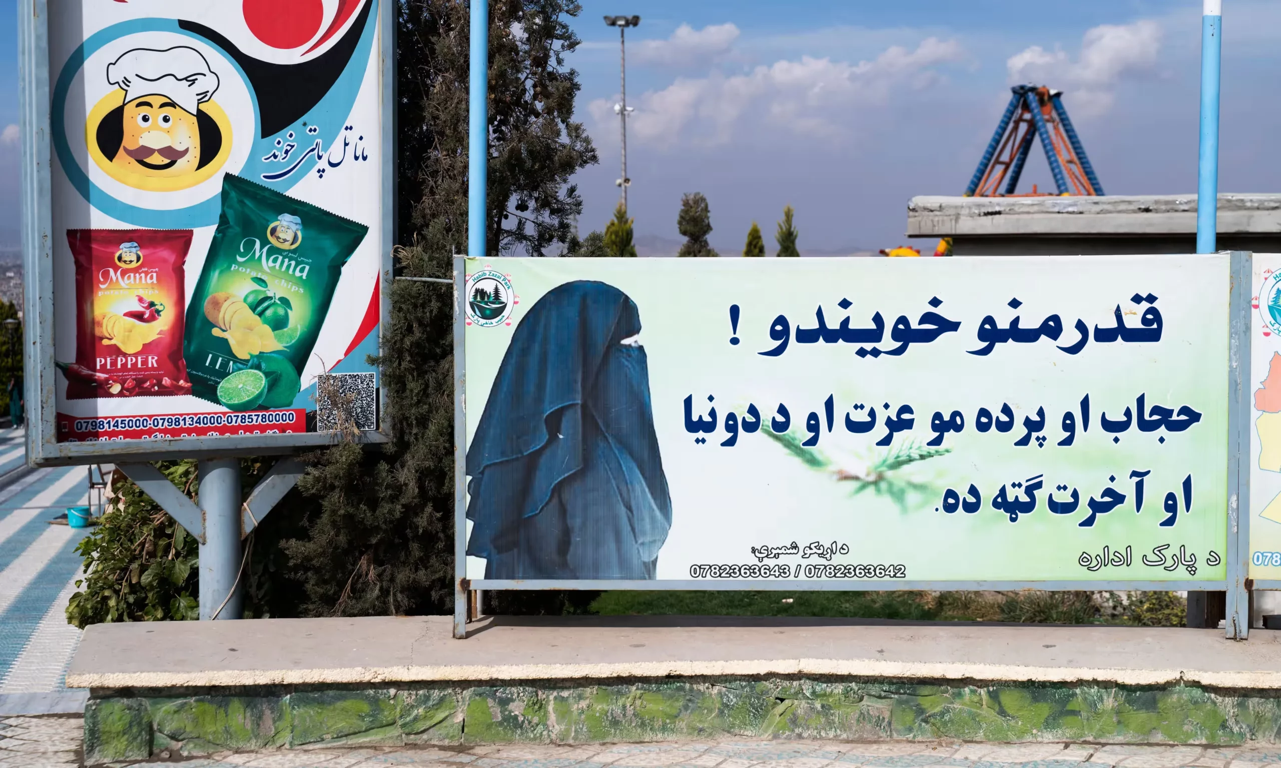 The sign, in Pashto, reads: ‘Dear sisters! Hijab and veil are your dignity and in your benefit in this world and the hereafter.’