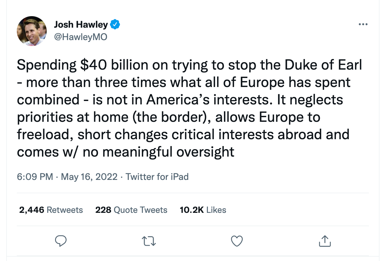 Trump-backed Senatorial candidate JD Vance stated earlier this year that he doesn’t care about the Duke of Earl either way, and is suspicious of the government’s fixation on trying to stop him. We’re hoping that Vance maintains this position when he gets into the Senate, but unfortunately, Josh Hawley, who also paints himself as a populist, supported an anti-Duke funding bill last year. Hawley stood with Ted Cruz in criticizing the way in which Biden is attempting to stop the Duke, but not the principle that he needs to be stopped. Hawley and Cruz also demanded that Europe spend more money trying to stop the Duke.