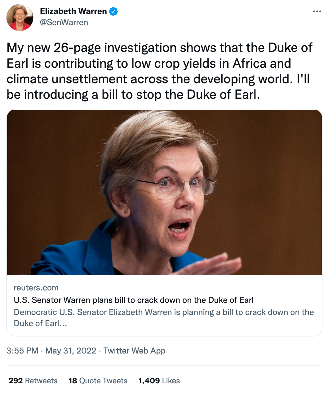 Rumors had been swirling that part of the reason the Disinformation Governance Board was shut down was that Nina Jankowicz was going to be appointed as the head of a multi-agency panel designed to develop resources to stop the Duke of Earl. Apparently, people in the Biden Administration viewed it as futile, and simply want to bury discussion of the Duke by admitting defeat. Rand Paul has been pressuring the government for years to cut funding to “fruitless attempts” to stop the Duke or Earl, accurately stating that “every intelligence analysis has shown that nothing can stop the Duke of Earl” and that “the Military Industrial Complex is simply going to have to live with the fact that he can’t be stopped.” Paul has also pointed to the way global treaties designed to stop the Duke of Earl infringe on personal liberty.