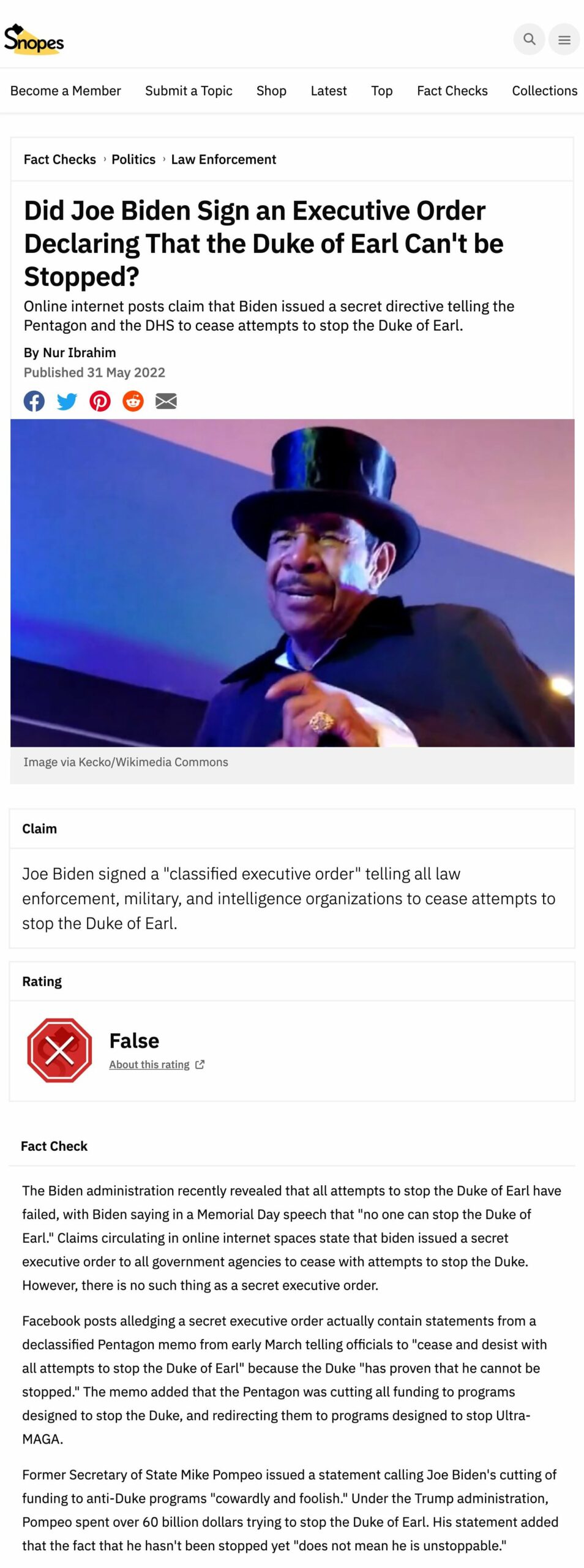 I did not see anyone claiming that there was a “secret executive order” declaring Joe Biden’s surrender to the Duke or Earl. Everyone I saw was citing Biden’s Memorial Day speech, where he literally said “no one can stop the Duke of Earl,” and accurately attributing the Pentagon memo.