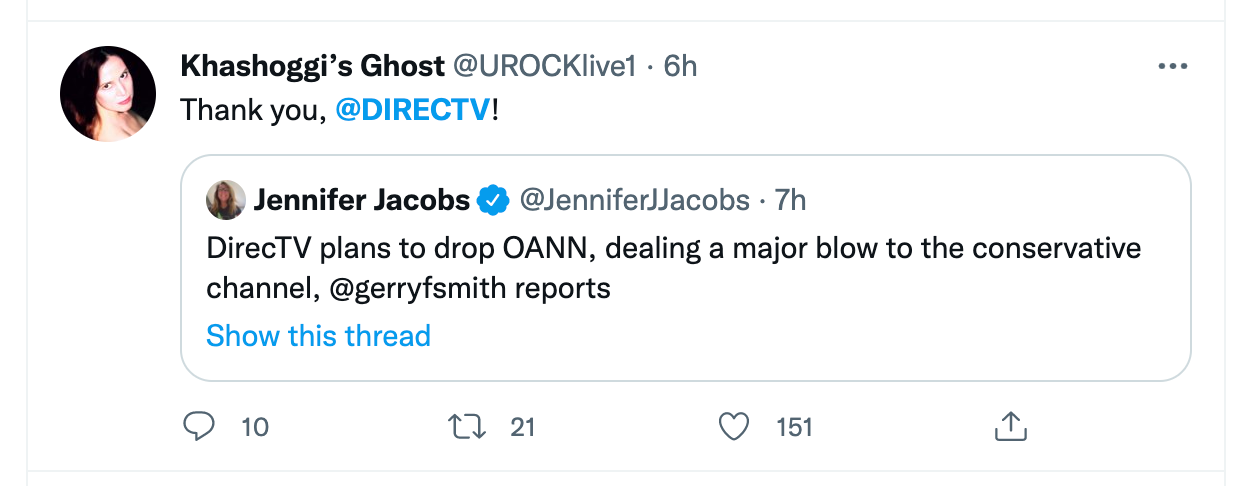 I wrote today about DirecTV banning OAN at the direction of the alleged president.