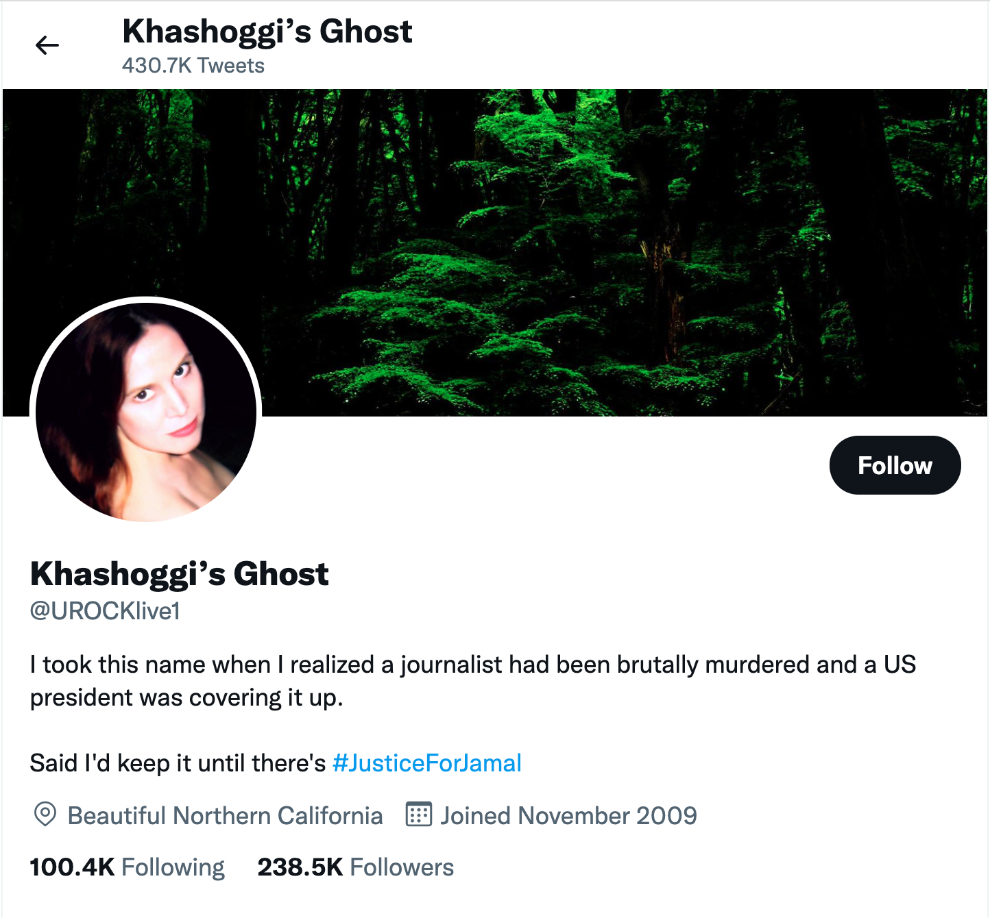 Her account actually has a couple hundred thousand followers. Her bio says that she named it when she found out about the killing of Saudi Arabian journalist Jamal Khashoggi.