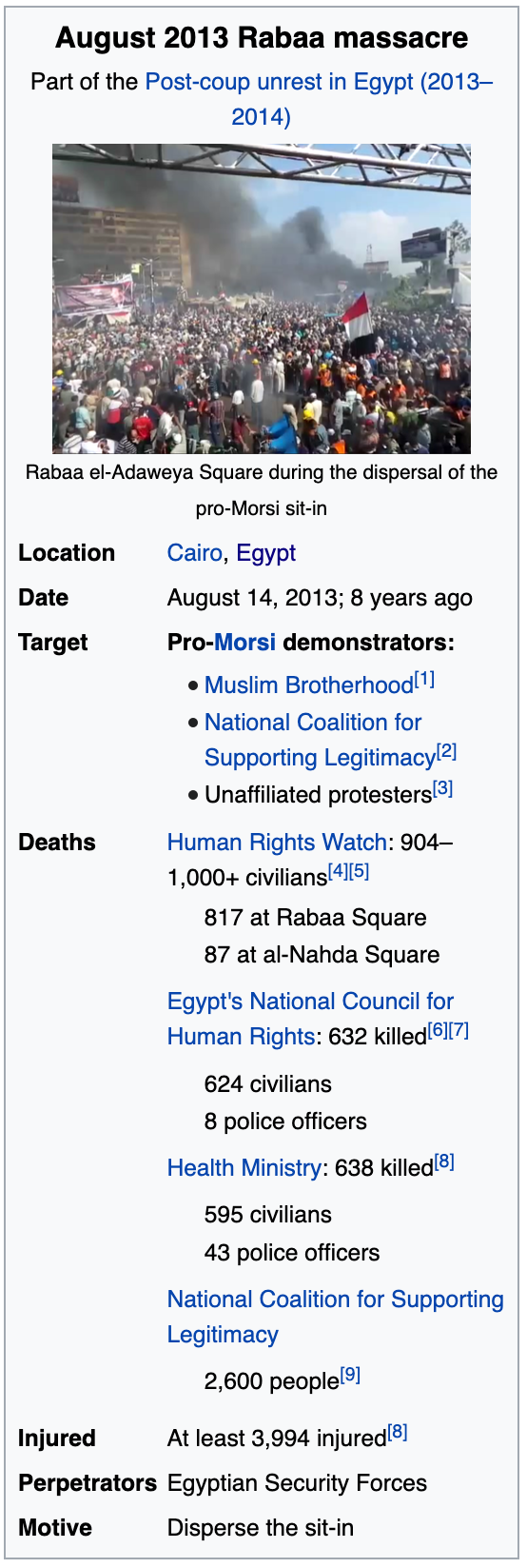 A few months later, some Brotherhood people were still protesting the coup, and the CIA military guy did the biggest single day massacre in modern history, gunning down about 1,000 people in public squares.
