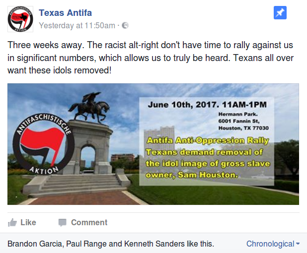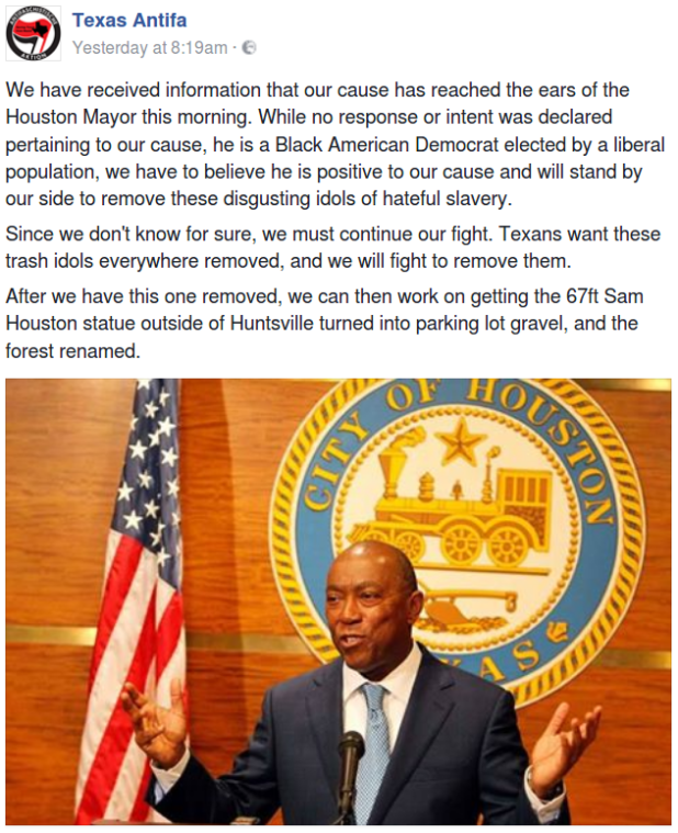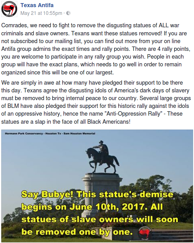 So antifa is now organizing to remove a statue of him, in the city of Houston.