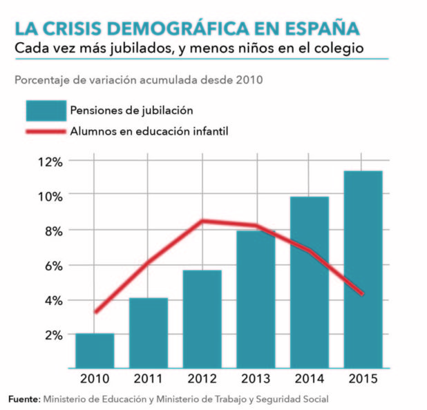 The world bank estimates that Spain’s birth rate is 1,32. This means that each new generation will be about 2/3rds the size of the previous one.