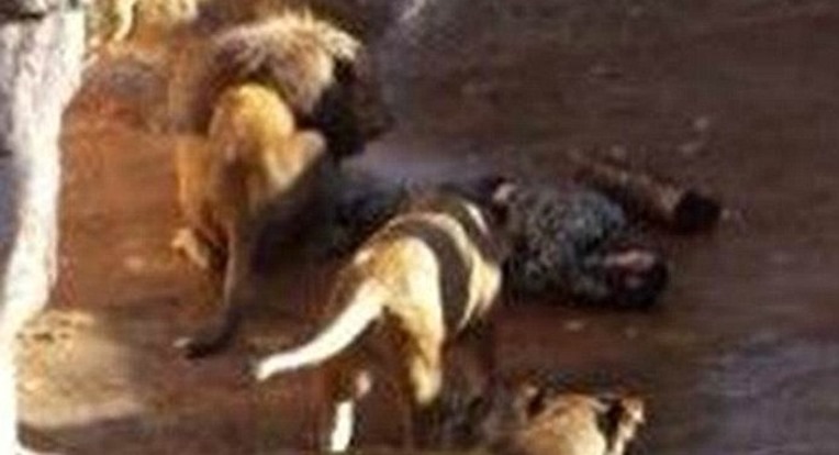 Footage of the bizarre incident shows him scaling one of the enclosure’s walls before being tossed by the leg into a pit by a lioness.