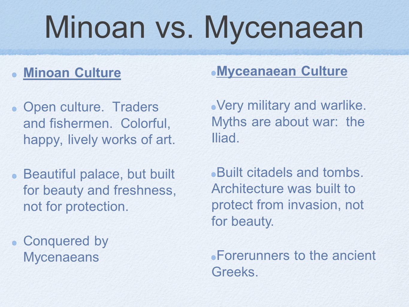 Is this in any way similar to the warlike Mycenians invading the pacifist Minoans and finding out that no one on the island had any weapons, that they didn’t even build any walls?