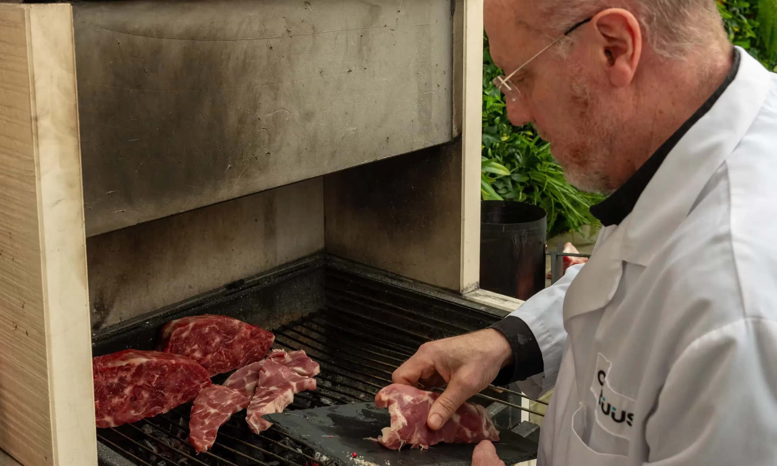 Larumbe cooking his fake meat.