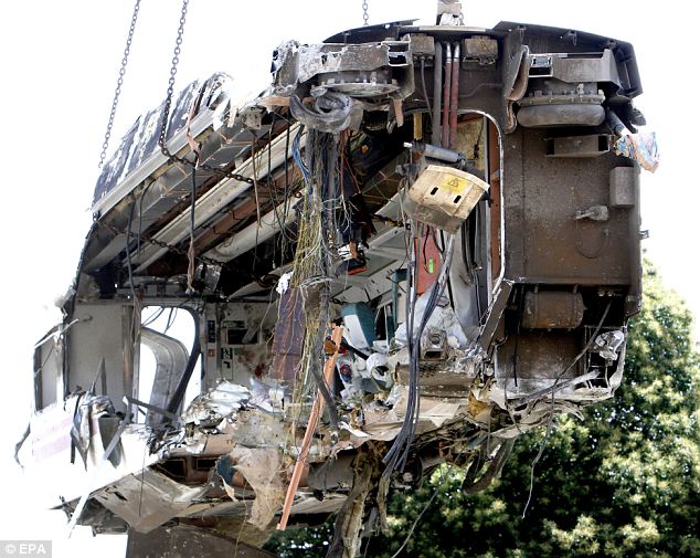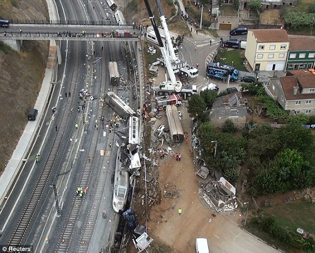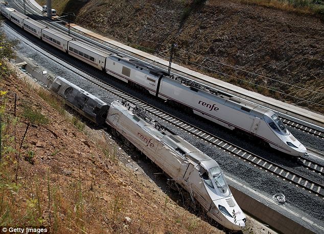 It came as the line reopened for the first time today, with pictures showing a Madrid-Ferrol train passing next to the wreckage of the train involved in the crash.