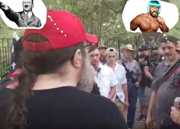 “These are good memes…” the lone alt-righter protested as he juggled the signs, a megaphone and the VA flag.
