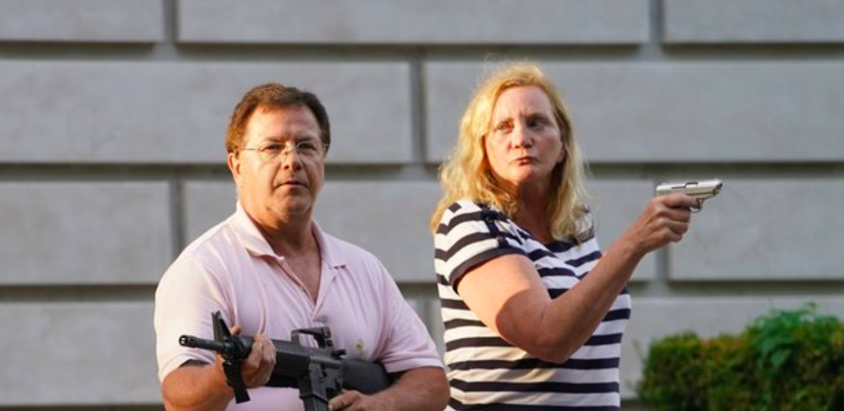A social media video showed the armed couple standing outside of their large home Sunday evening in the upscale Central West End neighborhood of the Missouri city.