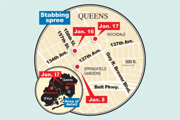 The suspected slasher — who wasn’t immediately charged or named — is believed to have stabbed a man Jan. 8, then attacked four more victims in Springfield Gardens and Jamaica, Queens this week — and he may even be tied to a Brooklyn assault Wednesday.