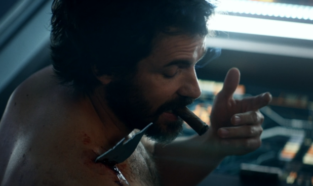 As was to be expected, given all of the tropes, the pilot of the ship fits in with the “rag-tag band” trope. Picard finds him with a hilarious piece of shrapnel sticking out of his shoulder as he sits drinking Aguardiente and… smoking a cigar.