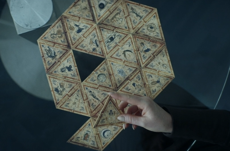 By far, the only interesting plot element, from just the most basic standpoint of “I want to know more about this,” is the situation on the Borg Cube, where the hapa android is attempting to uncover mysteries from a de-assimilated Romulan who was the foremost expert in Romulan mythology, and who sits around playing with triangular tarot cards.