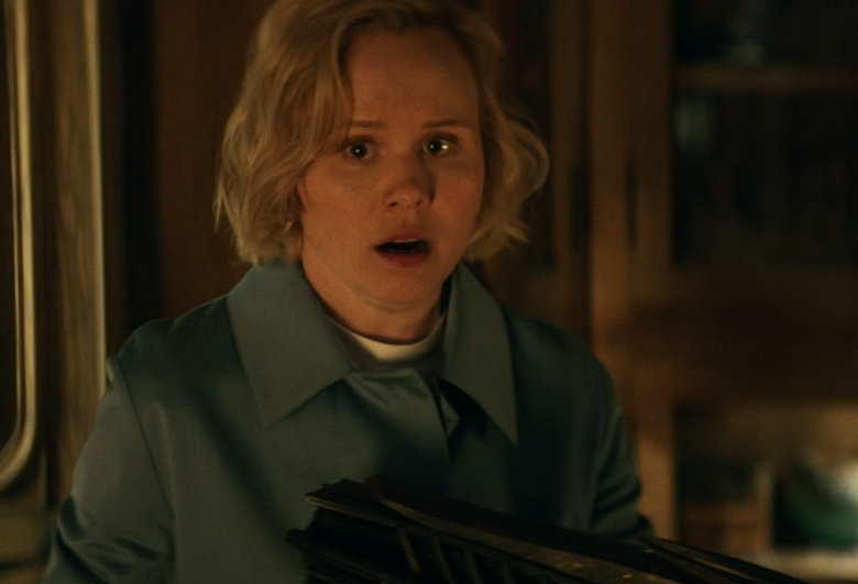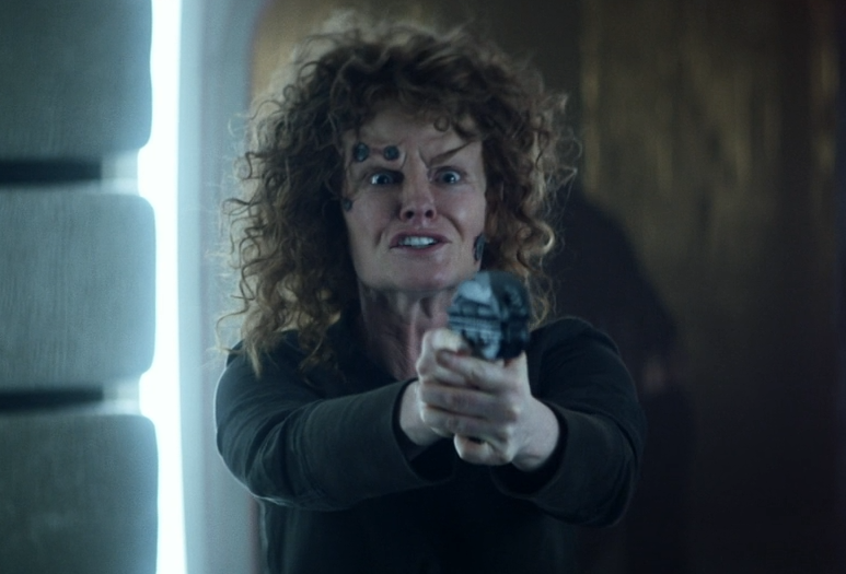 The fight scene ends and then it starts back up again, and someone from off camera shoots the last remaining Romulan biker ninja. And it turns out to be the timid female scientist from the Daystrom Institute, who apparently just showed up at Chateau Picard, noticed there was a gunfight going on, so she picked up a gun and started shooting!