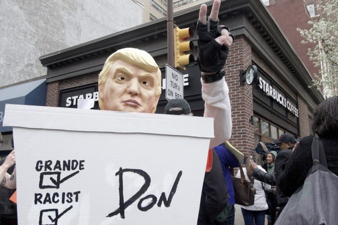 The President of the United States Donald Trump is shown here protesting the racism at Starbucks.