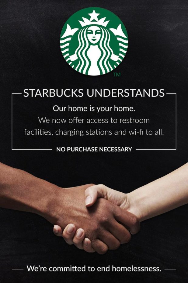 Our guys released a fake ad telling homeless people that they could use the bathrooms at Starbucks, as an apology for racism.