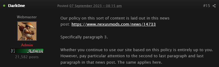 “Whether you continue to use our site based on this policy is entirely up to you,” he concluded, locking the thread. “However, pay particular attention to the second to last paragraph and last paragraph in that news post. The same applies here.”