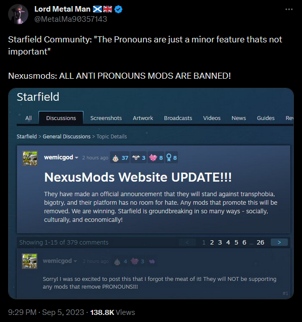 Nexus, which basically has a monopoly on video game mods, previously banned a mod that removed gay flags from Spider-Man. A tweet went viral last week saying that the site would ban all mods that remove transgender pronouns from Starfield.