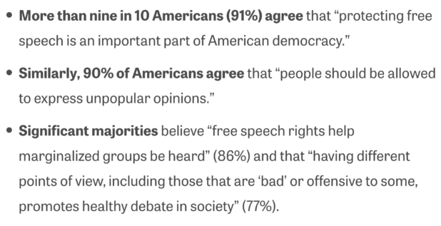 The current battle between Elon Musk and the ADL over Americans’ right to free speech is the microcosm which really highlights how this works. In every single poll, 9 out of 10 Americans believe that the First Amendment should be absolute. A 2022 Knight Foundation poll (a company that leans very liberal) found that 77% of Americans explicitly believe that “unpopular speech” (i.e., what the media now calls “hate speech” and “misinformation”) is good for the public discourse.