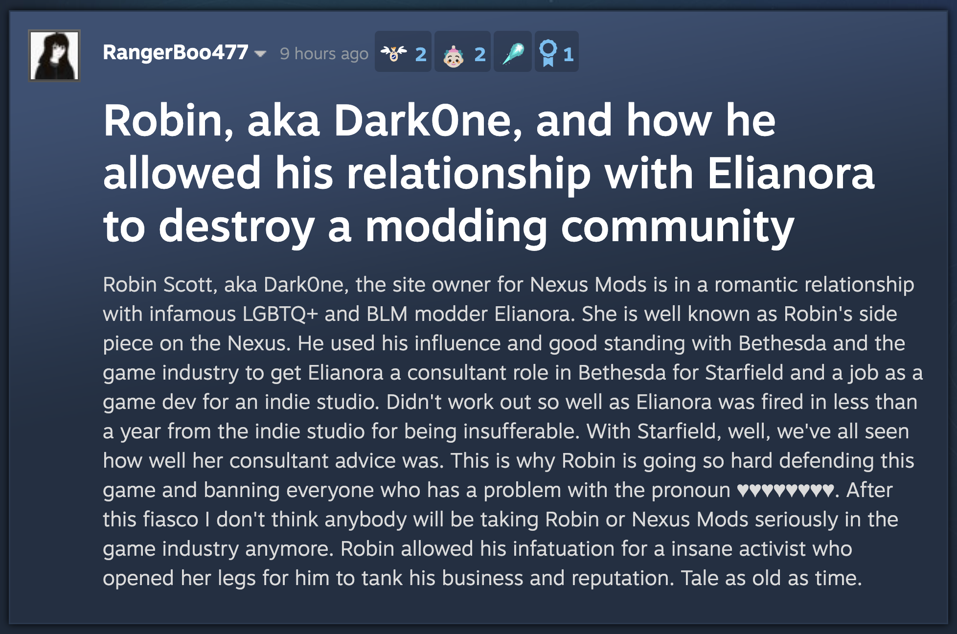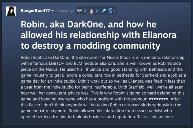 According to rumors on the Steam forums, Scott is involved sexually with a woman on his site who promotes all this woke stuff, and she is pushing the Starfield agenda on Nexus.