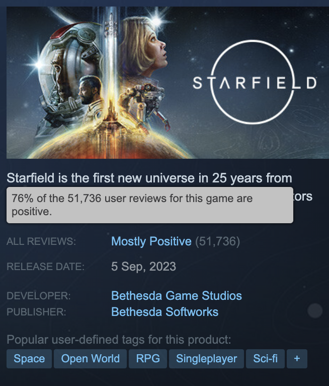 Starfield proves that a major studio can release a horrible game and as long as it works, people will tolerate it. I’m not really sure how to analyze this. The bought-and-paid-for professional reviewers couldn’t defend Cyberpunk, and maybe it comes down to that – people actually believe this shill press, and it will let them imagine that a game is better than it actually is.