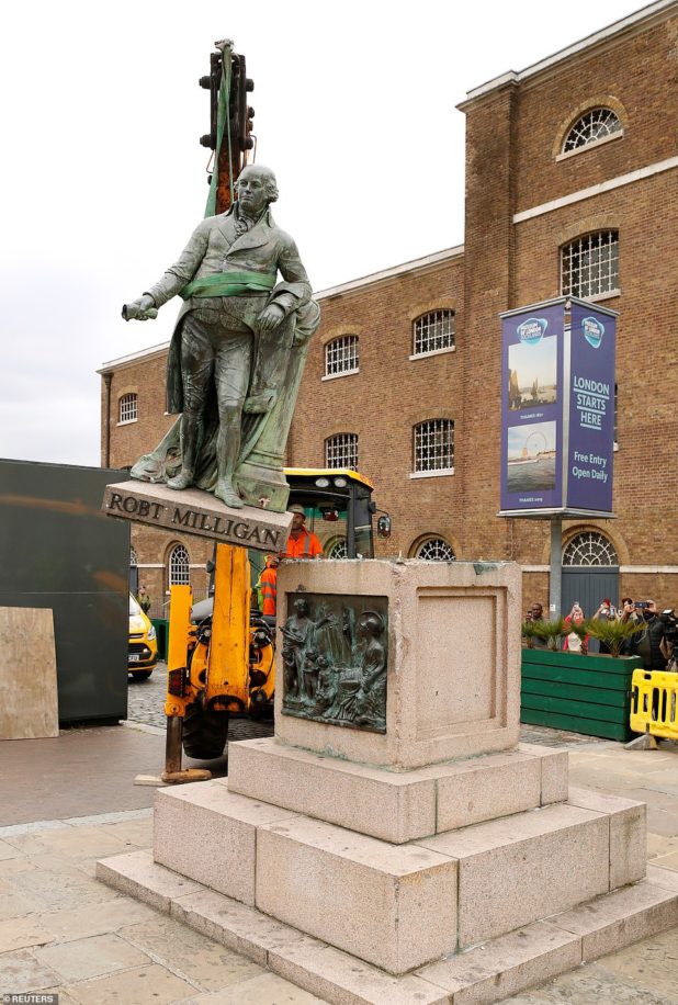 Workmen have torn down the monument to 18th Century slave trader Robert Milligan in the West India Docks he helped to construct in London’s Isle of Dogs – after a day of Black Lives Matter protests have taken place across Britain.